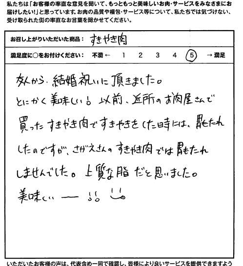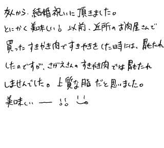 友人から結婚祝いに頂きました。とにかく美味しい!以前、近所のお肉屋さんで買ったすきやき肉ですきやきをした時には、胃もたれしたのですが、さがえさんのすきやき肉では胃もたれしませんでした。上質な脂だと思いました。美味しいーー!!