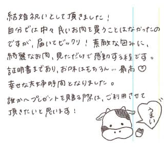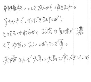 結婚祝いとして頂きました!自分では中々良いお肉を買うことはなかったのですが、、届いてビックリ!素敵な包みに、綺麗なお肉、見ただけで感動する程です。証明書まであり、お味はもちろん…最高♡ 幸せな夫婦時間となりました。誰かへプレゼントを贈る際は、ご利用させて頂きたいと思います!