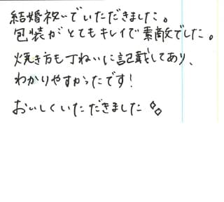 結婚祝いでいただきました。包装がとてもキレイで素敵でした。焼き方も丁ねいに記載してあり、わかりやすかったです!おいしくいただきました☆