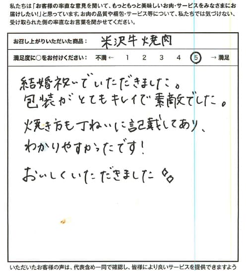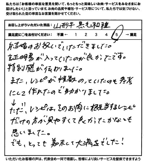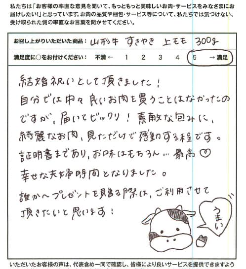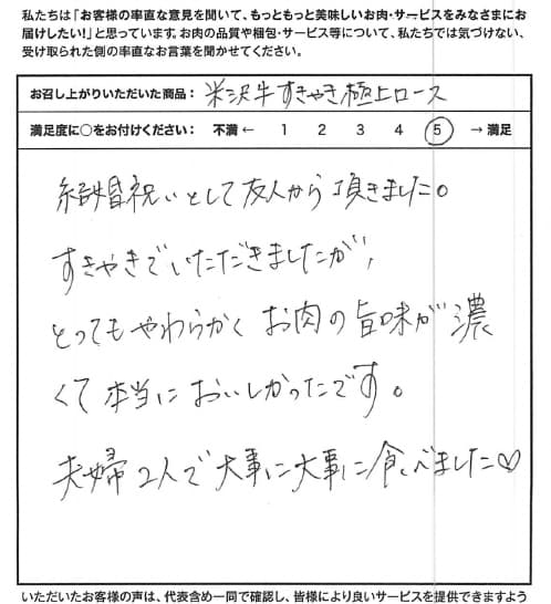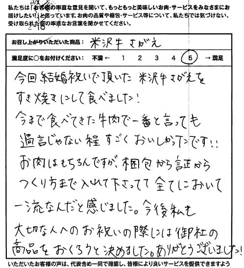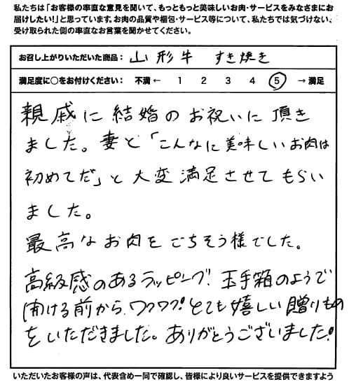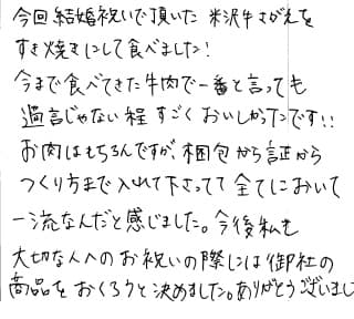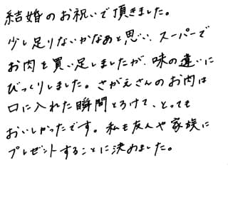 結婚のお祝いで頂きました。少し足りないかなあと思い、スーパーでお肉を買い足しましたが、味の違いにびっくりしました。さがえさんのお肉は口に入れた瞬間とろけて、とってもおいしかったです。私も友人や家族にプレゼントすることに決めました。