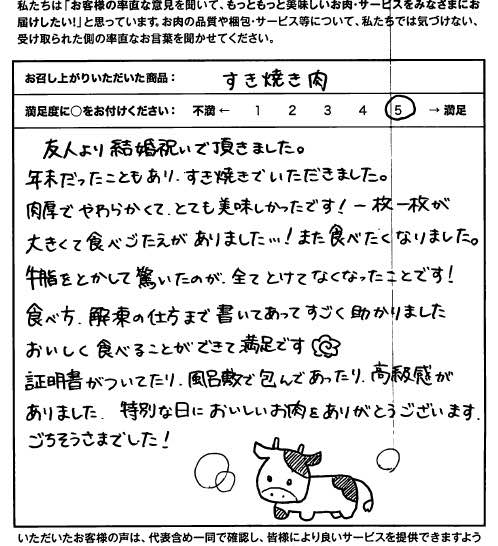 友人より結婚祝いで頂きました。年末だったこともあり、すき焼きでいただきました。肉厚でやわらかくて、とても美味しかったです!一枚一枚が大きくて食べ応えがありました…!また食べたくなりました。牛脂をとかして驚いたのが、全て溶けてなくなったことです!食べ方、解凍の仕方まで書いてあってすごく助かりました。おいしく食べることができて満足です。証明書がついてたり、風呂敷で包んであったり、高級感がありました。特別な日においしいお肉をありがとうございます。ごちそうさまでした!
