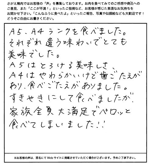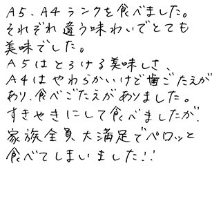 お客さまの声や口コミ・レビューをご紹介いたします。お寄せいただいた温かいお言葉を励みに、もっと、もっと、ご満足いただけるお肉をご提供できるよう努めてまいります。