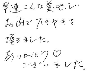 早速こんな美味しいお肉でスキヤキを頂きました。ありがとうございました。