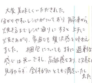 大変美味しくいただきました。分かりやすいレシピがついており、解凍から焼き方までレシピ通りにすると上手に焼きあがり、家庭でも贅沢感を味わえました。梱包についても特に過剰な感じは無いですし、高級感もあり、改善点は見当たらず、全体的にとても満足いたしました。