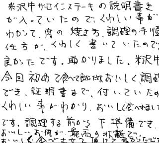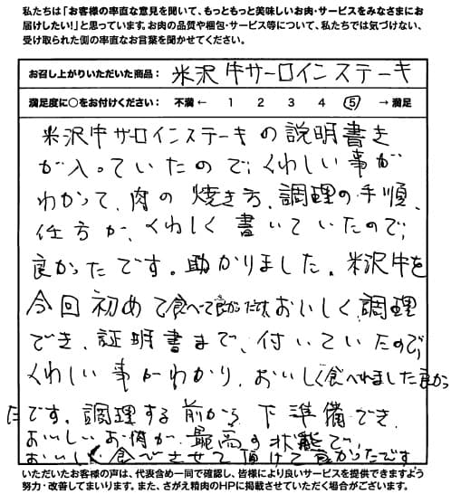 米沢牛サーロインの説明書きが入っていたので、くわしい事がわかって、肉の焼き方・調理の手順・仕方が、くわしく書いていたので良かったです。助かりました。 米沢牛を今回初めて食べて良かったです。 おいしく調理でき、証明書まで付いていたので、くわしい事がわかり、おいしく食べれました。良かったです。 調理する前から下準備でき、おいしいお肉が最高の状態でおいしく食べさせて頂けて良かったです。