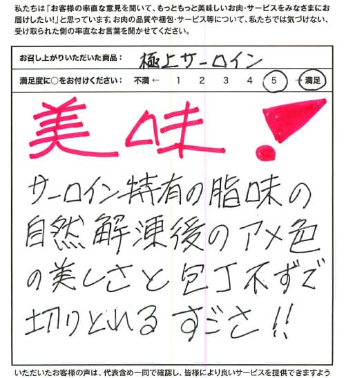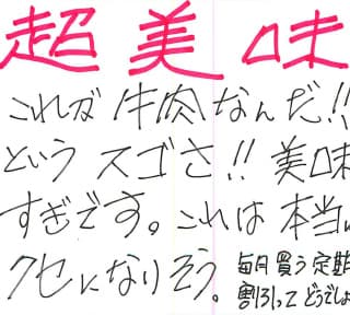 お客さまの声や口コミ・レビューをご紹介いたします。お寄せいただいた温かいお言葉を励みに、もっと、もっと、ご満足いただけるお肉をご提供できるよう努めてまいります。