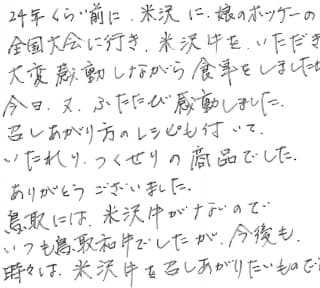 24年くらい前に米沢に娘のホッケーの全国大会に行き、米沢牛をいただき大変感動しながら食事をしましたが、今日又ふたたび感動しました。 召し上がり方のレシピも付いて、いたれりつくせりの商品でした。 ありがとうございました。 鳥取には米沢牛がないのでいつも鳥取和牛でしたが、今後も時々は米沢牛を召し上がりたいものです。