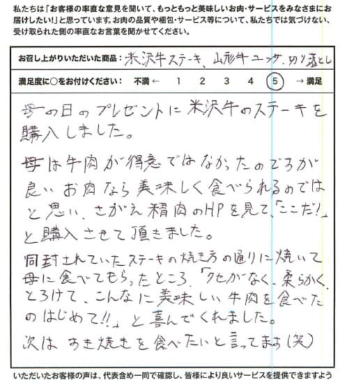 母の日のプレゼントに米沢牛のステーキを購入しました。母は牛肉が得意ではなかったのですが良いお肉なら美味しく食べられるのではと思い、さがえ精肉のHPを見て、「ここだ!」と購入させて頂きました。同封されていたステーキの焼き方の通りに焼いて母に食べてもらったところ、「クセがなく、柔らかく、とろけて、こんなに美味しい牛肉を食べたの初めて!!」と喜んでくれました。次はすき焼きを食べたいと言ってます(笑)