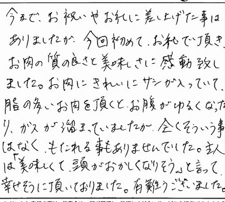 今までお祝いやお礼に差し上げた事はありましたが、今回初めてお礼で頂き、お肉の質の良さと美味しさに感動致しました。お肉に綺麗にサシが入っていて、脂の多いお肉を頂くと、お腹がゆるくなったり、ガスが溜まっていましたが、全くそういう事はなく、もたれる事もありませんでした。主人は「美味しくて、頭がおかしくなりそう」と言って幸せそうに頂いておりました。有難うございました。