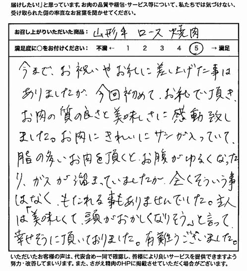 3月に母から内定祝いとして送ってもらいました。普段一人暮らしで食べるお肉とは断然違いお肉の脂がとろけるようで、二日に分けて食べようと考えていたのに手が止まりませんでした。人生初めてこんなに美味しいお肉を食べることができたので、来年初任給が出た時に家族に貴社から注文させていただき送りたいとと思います。ありがとうございました。