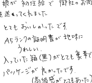 娘が初任給で御社のお肉を送ってくれました。とてもおいしかったです。A5ランクの証明書が地味にうれしい。入っていた箱(黒)がとても豪華でパッケージが良かったです(高級感がとてもあった)。