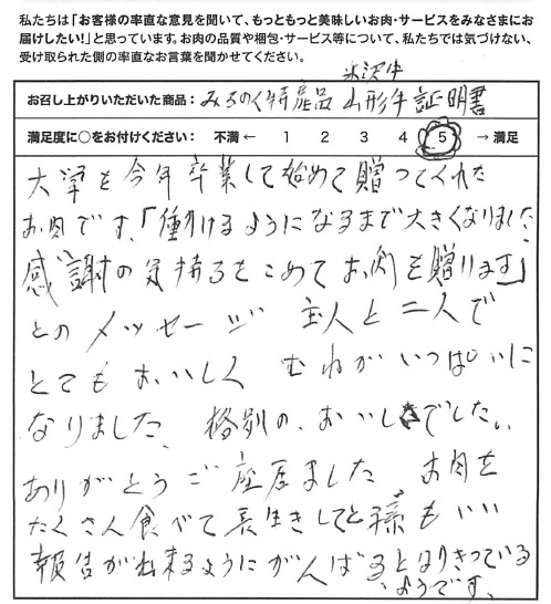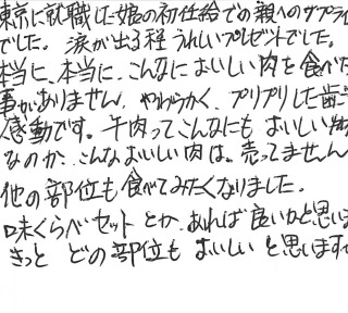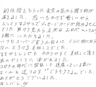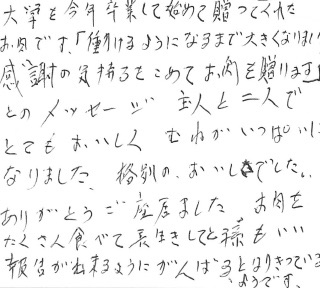 大学を今年卒業して初めて送ってくれたお肉です。「働けるようになるまで大きくなりました。感謝の気持ちをこめてお肉を贈ります」とのメッセージ。主人と二人でとてもおいしく胸がいっぱいになりました。格別のおいしさでした。ありがとうございました。お肉をたくさん食べて長生きしてと孫もいい報告が出来るようにがんばるとはりきっているようです。