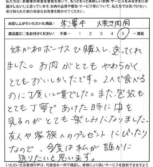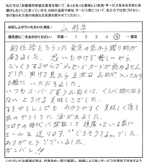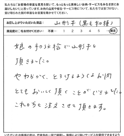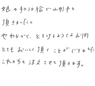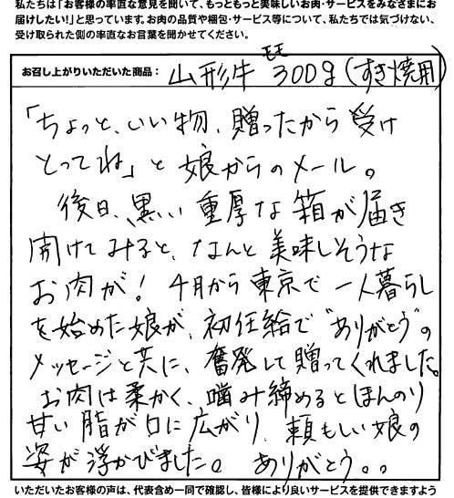 娘の初任給で山形牛を頂きました。やわらかく、とろけるようなお肉。とてもおいしく頂くことができました。これからも注文させて頂きます。
