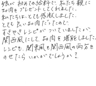娘が初めての給料で、私たち親にお肉をプレゼントしてくれました。私たちは、とても感激しました。とても良いお肉だったので、すきやきレシピがついていましたが、関西風にしてお肉を堪能しました。レシピも関東風と関西風の両方をのせたらいかがでしょうか?