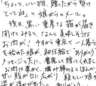 「ちょっといい物、贈ったから受け取ってね」と娘からのメール。後日、黒い重厚な箱が届き開けてみると、なんと美味しそうなお肉が!4月から東京で一人暮らしを始めた娘が、初任給で「ありがとう」のメッセージと共に、奮発して贈ってくれました。お肉は柔らかく、噛み締めるとほんのり甘い脂が口に広がり、頼もしい娘の姿が浮かびました。ありがとう。。