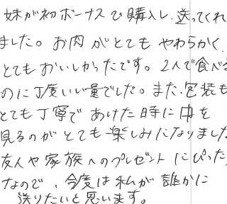 妹が初ボーナスで購入し、送ってくれました。お肉がとてもやわらかく、とてもおいしかったです。2人で食べるのにちょうどいい量でした。また、梱包もとても丁寧であけた時に中を見るのがとても楽しみになりました。友人や家族へのプレゼントにぴったりなので、今度は私が誰かに送りたいと思います。