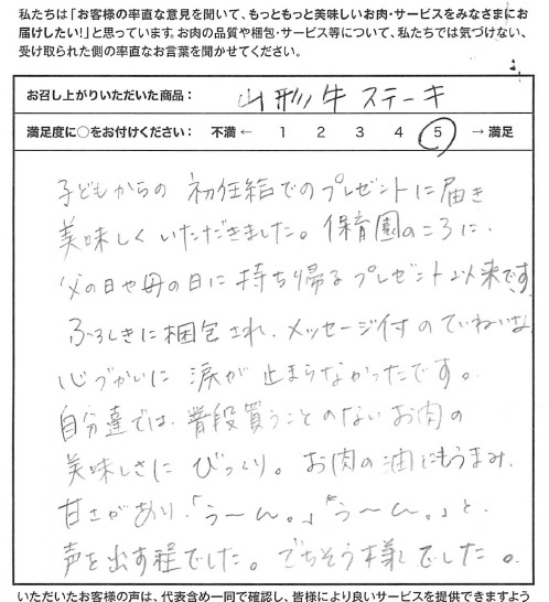 子どもからの初任給でのプレゼントに届き、美味しくいただきました。保育園のころに父の日や母の日に持ち帰るプレゼント以来です。ふろしきに梱包され、メッセージ付のていねいな心づかいに涙が止まらなかったです。自分達では、普段買うことのないお肉の美味しさにびっくり。お肉の脂にもうまみ、甘さがあり、「うーん」「うーん」と声を出す程でした。ごちそう様でした。