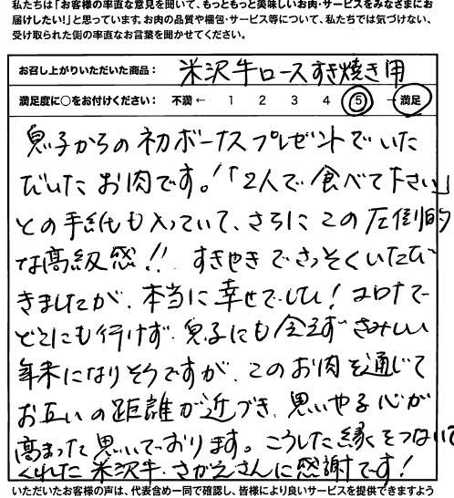 お肉を通じてお互いの距離が近づき、思いやる心が高まったと思っております。【米沢牛/すきやき 極上ロース/初任給・ボーナス】