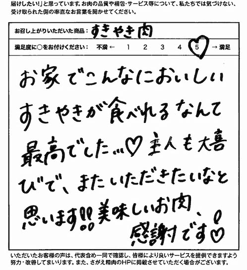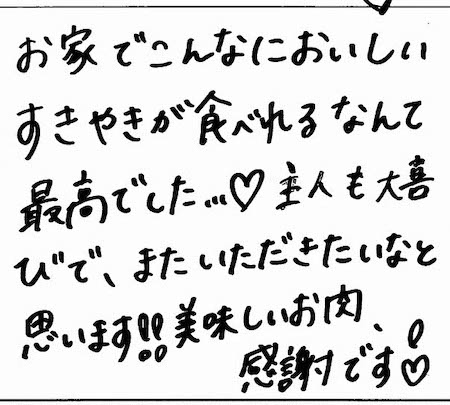 お家でこんなにおいしいすきやきが食べれるなんて最高でした...♡主人も大喜びで、またいただきたいなと思います!!美味しいお肉、感謝です♡