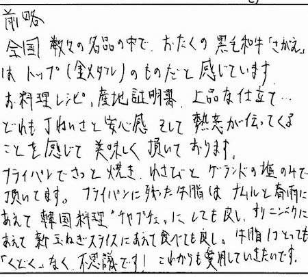 前略 全国数々の名品の中で、オタクの黒毛和牛「さがえ」はトップ(金メダル)のものだと感じています。お料理レシピ、産地証明書、上品な仕立て... どれも丁寧さと安心感、そして熱意が伝わってくることを感じて美味しく頂いております。フライパンでさっと焼き、わさびとゲランドの塩のみで頂いております。フライパンに残った牛脂はナムルと春雨にあえて韓国料理「チャプチェ」にしても良し。牛脂1つとっても「くどく」なく不思議です!これからも愛用していきたいです。