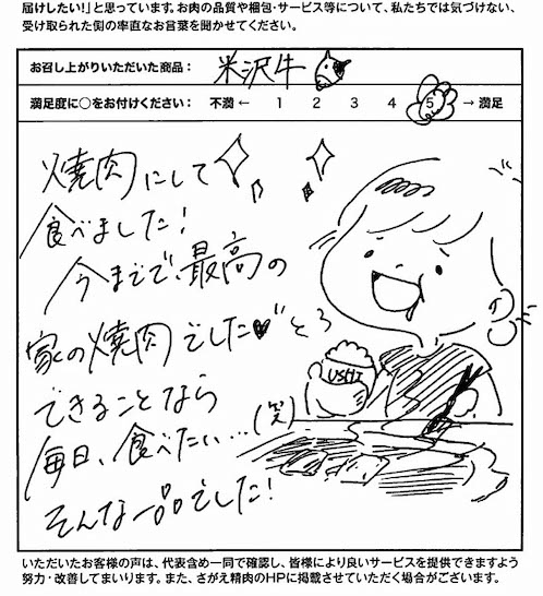 何度か購入させていただいておりますが、本当においしいです。もちろん日常的に買えるお値段ではありませんが、忙しい日々が続いた時や、落ち込んだ時、自分や家族を元気付けたい時に利用させていただいてます。ホームページで、購入画面に行く前から、いつ届くのか(いつから指定できるのか)が確認できるのもありがたいですし、何より、お肉のような冷凍のお品物は、送料もかなりかかることがあり、購入を悩んでしまいますが、さがえ精肉さんは、いつも送料込みで嬉しいです。改善点が見つかりませんでしたが、感謝を伝えさせていただきたく、書かせていただきました。いつも、おいしいものをありがとうございます。