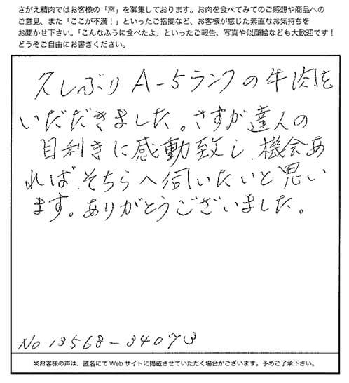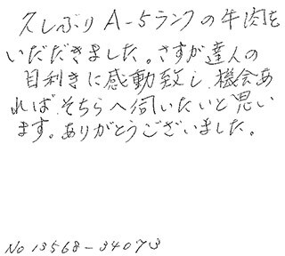 久しぶりにA-5ランクの牛肉をいただきました。さすが達人の目利きに感動致し、機会あればそちらへ伺いたいと思います。 ありがとうございました。