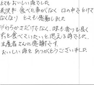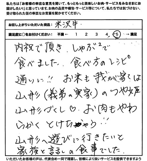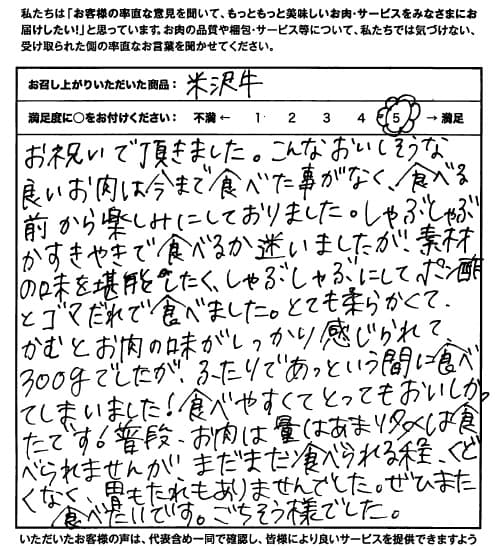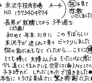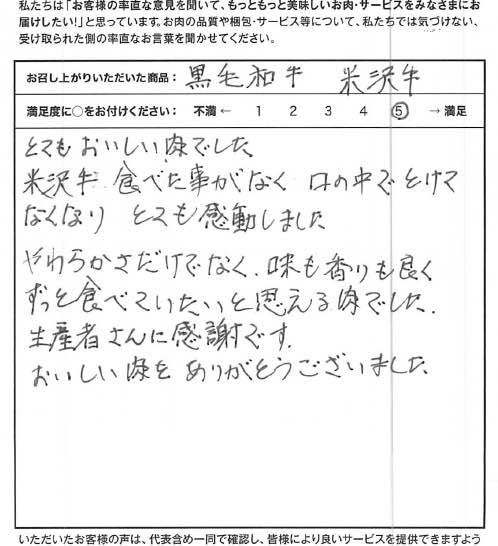 とてもおいしい肉でした。米沢牛を食べたことなく、口の中でとけてなくなり、とても感動しました。やわらかさだけでなく、味も香りも良くずっと食べていたいと思える肉でした。生産者さんに感謝です。おいしい肉をありがとうございました。