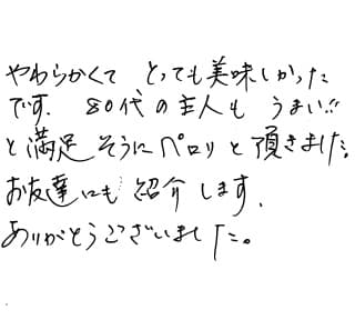 やわらかくてとっても美味しかったです。80代の主人もうまい!!と満足そうにペロリと頂きました。お友達にも紹介します。ありがとうございました。