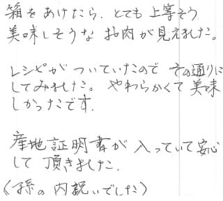 箱をあけたら、とても上等そう、美味しそうなお肉が見えました。レシピがついていたのでその通りにしてみました。やわらかくて美味しかったです。産地証明書が入っていて安心して頂きました。(孫の内祝いでした)