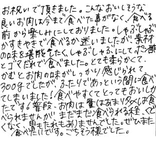 お祝いで頂きました。こんなおいしそうな良いお肉は今まで食べた事がなく、食べる前から楽しみにしておりました。しゃぶしゃぶかすきやきで食べるか迷いましたが、素材の味を堪能したく、しゃぶしゃぶにしてポン酢とゴマだれで食べました。とても柔らかくて、かむとお肉の味がしっかり感じられて、 300gでしたが、ふたりであっという間に食べてしまいました!食べやすくてとってもおいしかったです!普段、お肉は量はあまり多くは食べられませんが、まだまだ食べられる程、くどくなく、胃もたれもありませんでした。ぜひまた食べたいです。ごちそうさまでした。