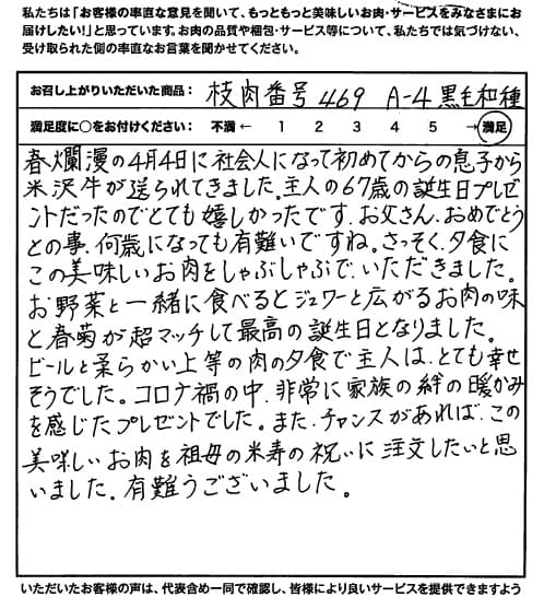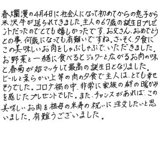 春爛漫の4月4日に社会人になって初めてからの息子から米沢牛が送られてきました。主人の67歳の誕生日プレゼントだったのでとても嬉しかったです。お父さん、おめでとうとの事、何歳になっても有難いですね。さっそく、夕食にこの美味しいお肉をしゃぶしゃぶで、いただきました。お野菜と一緒に食べるとジュワーと広がるお肉の味と春菊が超マッチして最高の誕生日となりました。ビールと柔らかい上等の肉の夕食で主人は、とても幸せそうでした。コロナ禍の中、非常に家族の絆の暖かみを感じたプレゼントでした。また、チャンスがあれば、この美味しいお肉を祖母の米寿の祝いに注文したいと思いました。有難うございました。