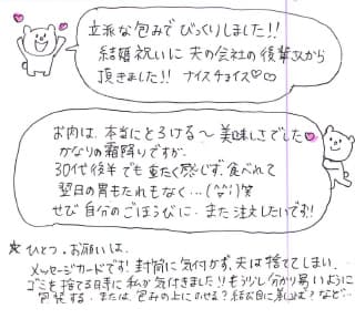 立派な包みでびっくりしました! 結婚祝いに夫の会社の後輩さんから頂きました!!ナイスチョイス♡♡ お肉は本当にとろける〜美味しさでした♡ かなりの霜降りですが、30代後半でも重たく感じず食べれて、翌日の胃もたれもなく…(^^;)笑 ぜひ自分のご褒美に、また注文したいです!!