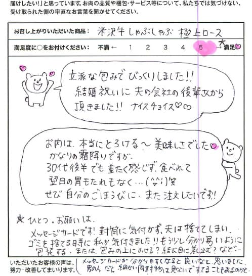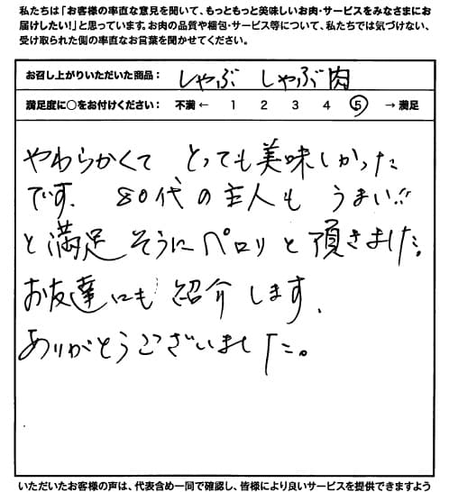 80代の主人もうまい!!と満足そうにペロリと頂きました【山形牛/しゃぶしゃぶ極上ロース/お取り寄せ】