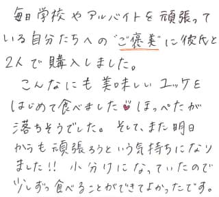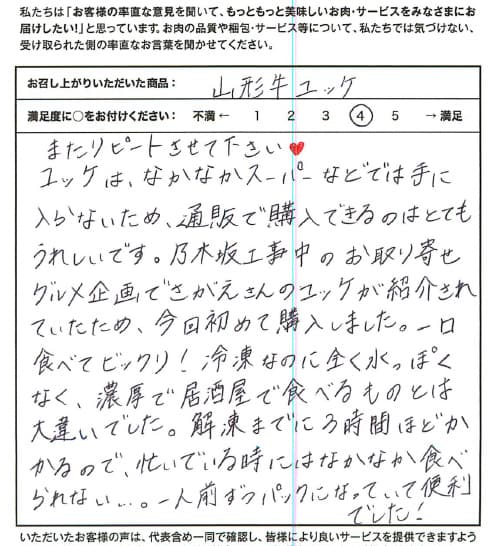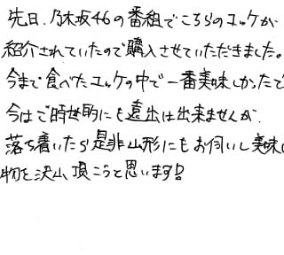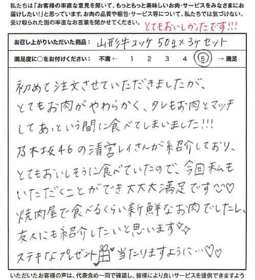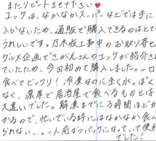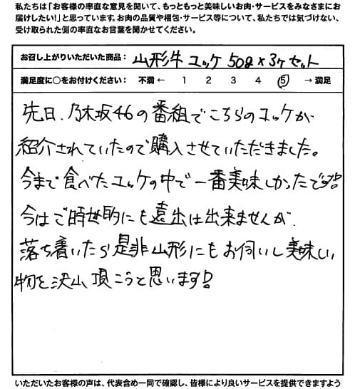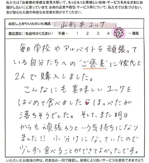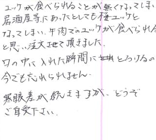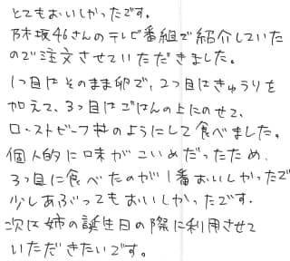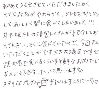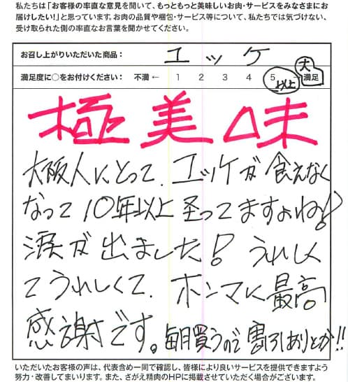 お客さまの声や口コミ・レビューをご紹介いたします。お寄せいただいた温かいお言葉を励みに、もっと、もっと、ご満足いただけるお肉をご提供できるよう努めてまいります。