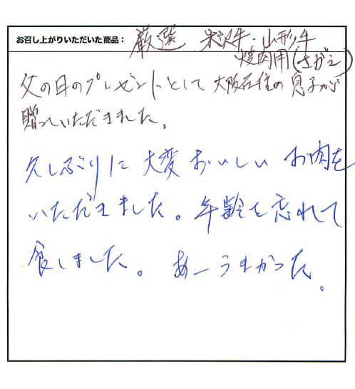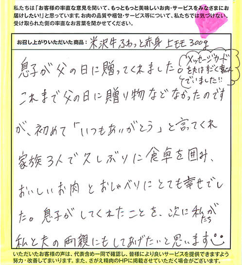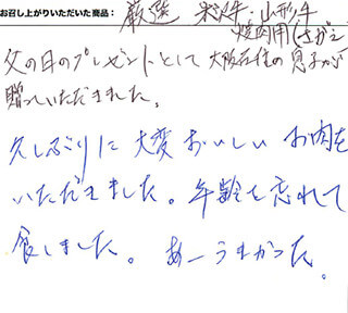 メッセージカードを夫はすごく喜んでいました【米沢牛/すきやき 上モモ/父の日】
