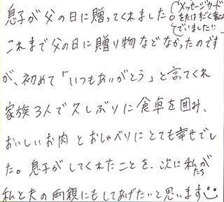 息子が父の日に贈ってくれました。(メッセージカードを夫はすごく喜んでいました!!)これまで父の日に贈り物などなかったのですが、初めて「いつもありがとう」と言ってくれ家族3人で久しぶりに食卓を囲み、おいしいお肉とおしゃべりにとても幸せでした。息子がしてくれたことを、次に私たちが私と夫の両親にもしてあげたいと思います(^^)