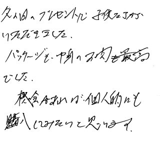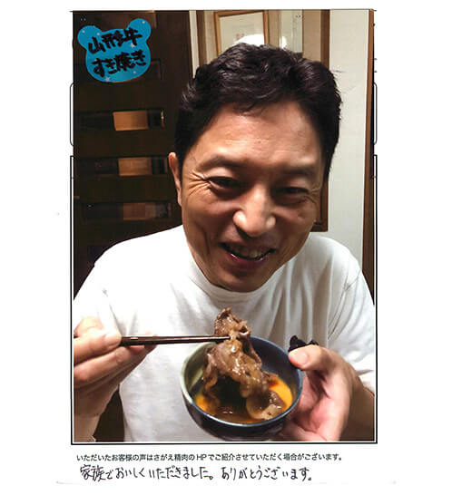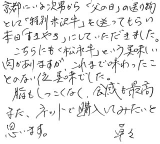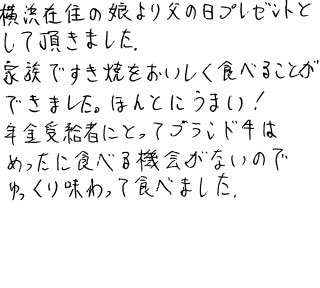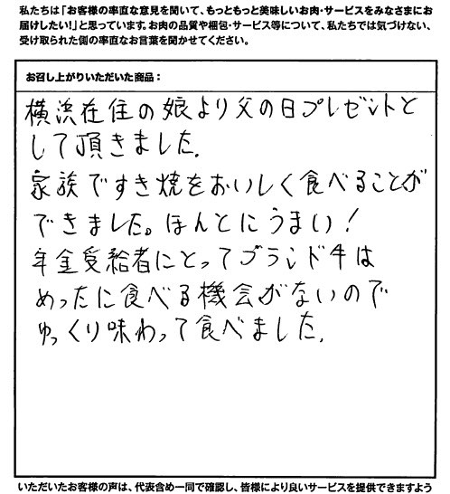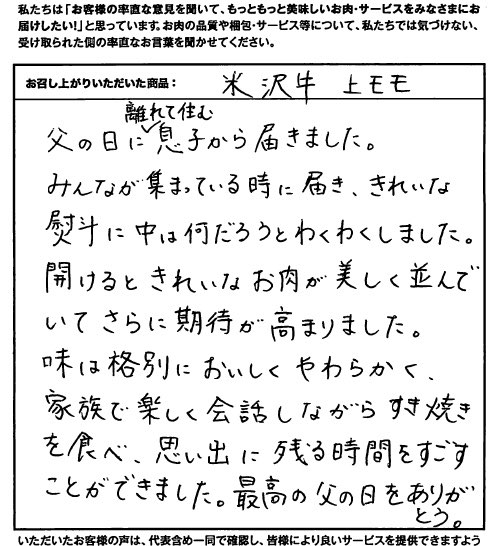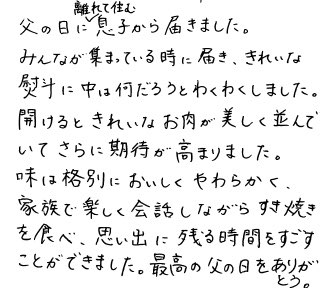 父の日に離れて住む息子から届きました。みんなが集まっている時に届き、きれいな熨斗に中は何だろうと、わくわくしました。開けるときれいなお肉が美しく並んでいて、さらに期待が高まりました。味は格別においしくやわらかく、家族で楽しく会話しながらすき焼きを食べ、思い出に残る時間をすごすことができました。最高の父の日をありがとう。