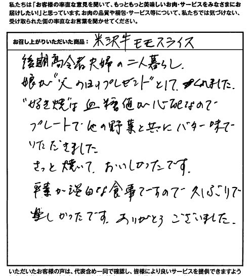 後期高齢者夫婦の二人暮らし。娘が「父の日のプレゼント」としてくれました。「好き焼」は血糖値が心配なので、プレートで他の野菜と共にバター味でいただきました。さっと焼いて、美味しかったです。平素が淡白な食事ですので、久しぶりで楽しかったです、ありがとうございました。