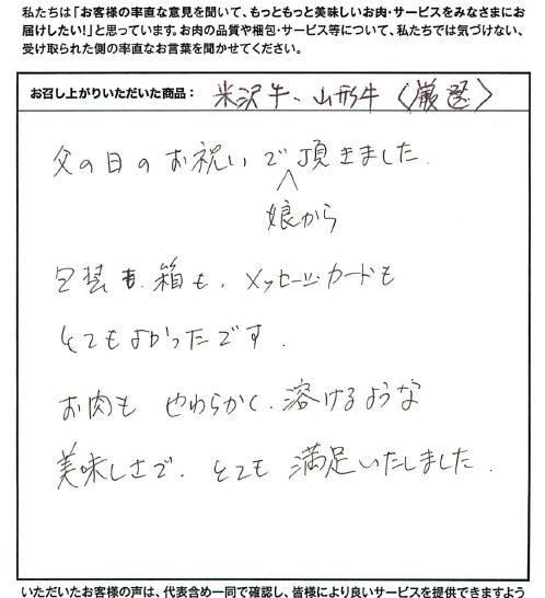 父の日のお祝いで娘から頂きました。包装も箱も、メッセージカードもとてもよかったです。お肉もやわらかく、溶けるような美味しさで、とても満足いたしました。