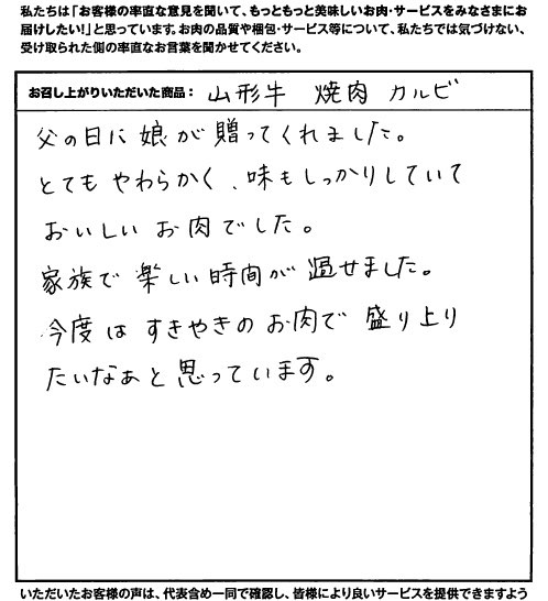 家族で焼き肉をして、とても楽しい時間が過ごせました【山形牛/焼肉極上カルビ/父の日】