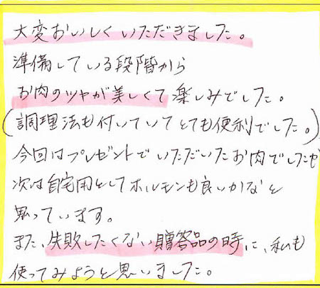 大変おいしくいただきました。準備している段階からお肉のツヤが美しくて楽しみでした。(調理法も付いていてとても便利でした。)今回はプレゼントでいただいたお肉でしたが、次は自宅用としてホルモンも良いかなと思っています。また、失敗したくない贈答品の時に、私も使ってみようと思いました。