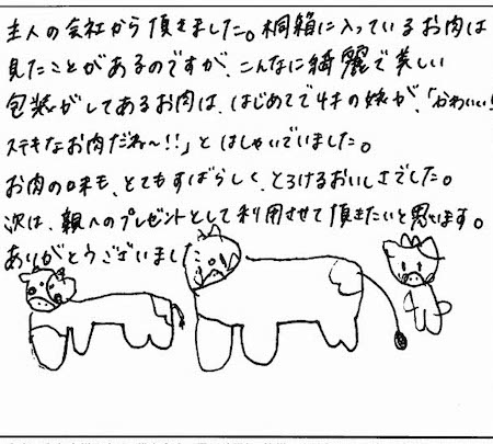 主人の会社から頂きました。桐箱に入っているお肉は見たことがあるのですが、こんなに綺麗で美しい包装がしてあるお肉は、はじめてで4才の娘が「かわいい!!ステキなお肉だね〜!!」とはしゃいでいました。お肉の味も、とてもすばらしくとろけるおいしさでした。次は親へのプレゼントとして利用させて頂きたいと思います。ありがとうございました。