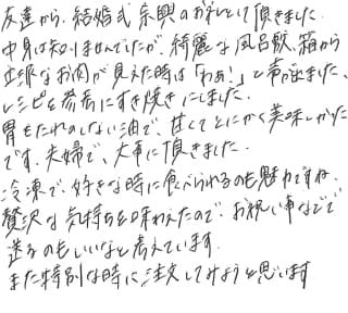 友達から、結婚式余興のお礼として頂きました。 中身は知りませんでしたが、綺麗な風呂敷、箱から立派なお肉が見えた時は「わあ!」と声が出ました。 レシピを参考にすき焼きにしました。 胃もたれのしない油で、甘くてとにかく美味しかったです。夫婦で、大事に頂きました。 冷凍で、好きな時に食べられるのも魅力ですね。 贅沢な気持ちを味わえたので、お祝い事などで送るのもいいなと考えています。 また特別な時に注文してみようと思います。