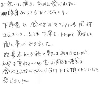 お祝いに頂き、初めて食べました。 脂身がとても甘くてびっくり! 下準備や食べ方のマニュアルも同封されていて、とても丁寧で、とにかく美味しく頂く事ができました。 改善点という程の事ではありませんが、年齢を重ねていくと良いお肉でも一度には食べきれないので、小分けにして頂くといいなと感じました。