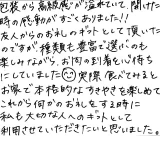 包装から高級感が溢れていて、開けた時の感動がすごくありました!! 友人からのお礼のギフトとして頂いたのですが、種類も豊富で選ぶのも楽しみにしたがら、お肉の到着を心待ちにしていました。実際食べてみるとお家で本格的なすきやきを楽しめてこれから何かのお礼をする時に私も大切な人へのギフトとして利用させていただきたいと思いました。
