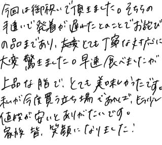 今回は御祝で頂きました。そちらの手違いで発着が遅れたとのことでお詫びの品まであり、とても丁寧な対応に大変驚きました。早速食べましたが、上品な脂で、とても美味しかったです。 私が今度買う立ち場であれば、もう少し値段が安いとありがたいです。 家族皆、笑顔になりました!