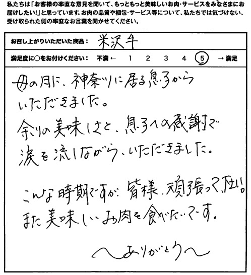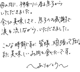 母の日に、神奈川に居る息子からいただきました。余りの美味しさと息子への感謝で涙を流しながらいただきました。こんな時期ですが、皆様頑張って下さい。また美味しいお肉を食べたいです。〜ありがとう〜