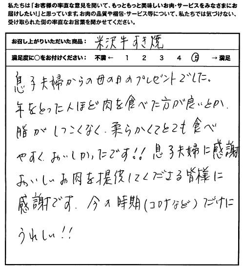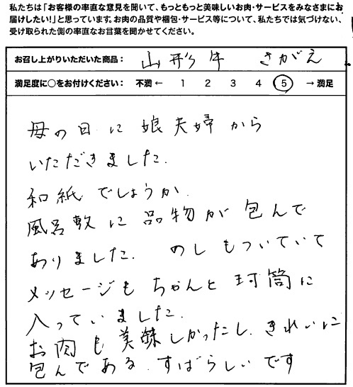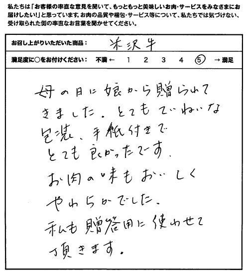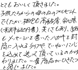 とてもおいしく頂きました。子供たちからの母の日のプレゼントでしたが梱包も高級感、安心感、(米沢牛証明書)、美しさもあり、手紙もメッセージを書いたハガキを封筒に入れるタイプでていねいに心を込めて送って頂いているのが伝わりました。一層商品がひきたつと感じました。