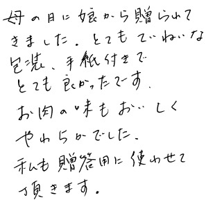 母の日に娘から贈られてきました。とてもていねいな包装、手紙付きでとても良かったです。お肉の味もおいしくやわらかでした。私も贈答用に使わせて頂きます。