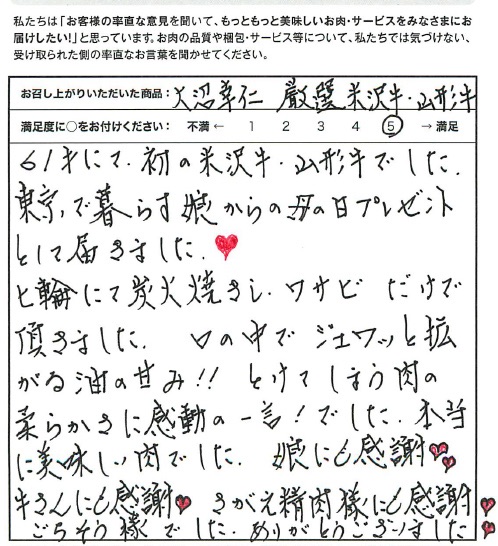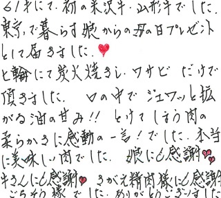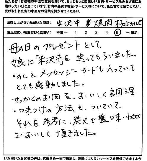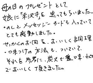 母の日のプレゼントとして、娘に「米沢牛」を送ってもらいました。のしとメッセージカードも入っていてとても感動しました。お肉をおいしく調理・味付けする方法もついていて、それを参考に、炭火で塩味・わさびでおいしく頂きました。
